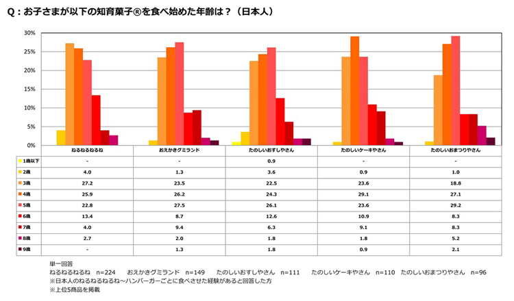 子どもが「ねるねるねるね」を食べたことがあると回答した日本人の母親に対して、食べ始めたのは何歳かを尋ねたところ、3歳(27.2%)と回答した人が最も多く、4歳では25.9%、5歳では22.8%と続いた。その他の知育菓子(R)では、「おえかきグミランド」5歳(27.5%)、「たのしいおすしやさん」は5歳(26.1%)、「たのしいケーキやさん」は4歳(29.1%)、「たのしいおまつりやさん」は5歳(29.2%)に食べ始めた人が最も多いという結果となった。