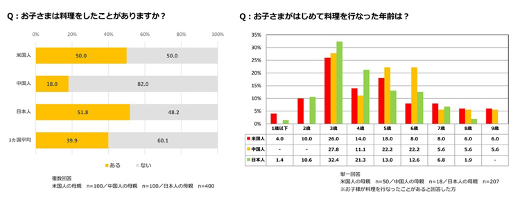 米国、中国、日本の母親を対象に子どもが「料理」をしたことがあるかを尋ねたところ、3カ国平均で39.9%が「料理」をしたことがあると回答した。国別でみると、日本では51.8%、米国では50.0%と半数を超えたのに対し、中国では18.0%という結果が得られた。