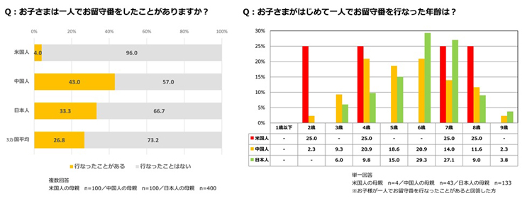各国の母親に、子どもに「一人でお留守番」をさせたことがあるかを尋ねたところ、中国では43.0%、日本では33.3%が「お留守番」をさせたことがあると回答したが、米国ではわずか4.0%にとどまった。また、初めての「お留守番」は何歳かを尋ねたところ、中国では「4歳」「6歳」がともに20.9%と最も多く、日本では「6歳」が29.3%だった。
