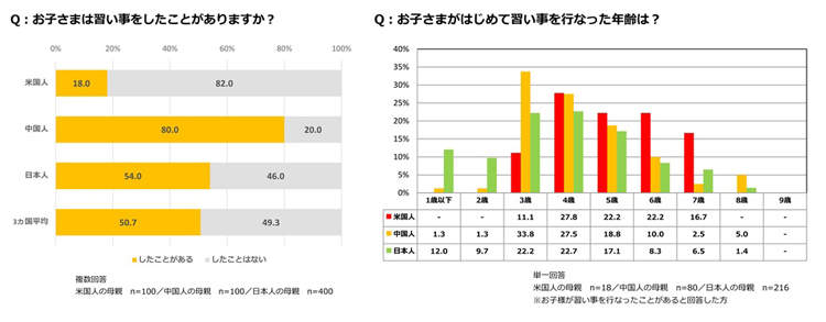 さらに、「習い事をしたことがある」と回答した人に対して、「習い事」を始めたのは何歳かを尋ねたところ、中国では「3歳」(33.8%)と最も多く、日本・米国では「4歳」(日本:22.7%、米国:27.8%)が最も多い結果となった。