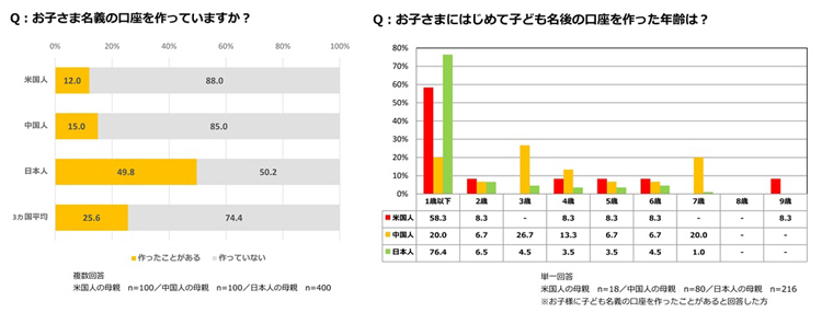 「子どもの名義の口座を作ったことがあるか」を尋ねたところ、日本では49.8%が「口座を開設した」と回答したのに対し、中国では15.0%、米国では12.0%しか口座を開設していないという結果だった。日本では、子どもが何歳のときに開設したかについては、76.4%が「1歳以下」と回答した。