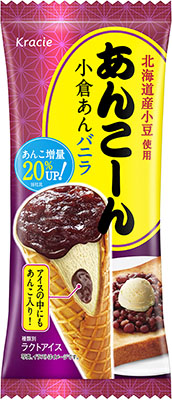 北海道産小豆を100%使用した風味豊かな小倉あんと、まろやかなバニラアイス、サクサクのワッフルシュガーコーンを組み合わせた「あんこーん」は、今回、あんこを従来品から20%増量し、アイスの中にもあんこを入れました。