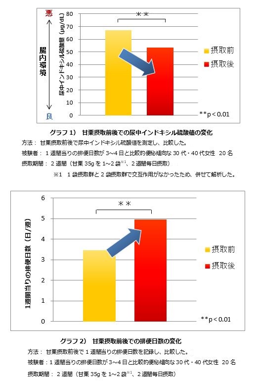 腸内環境の簡易的評価方法として、尿中のインドキシル硫酸値を測定する方法が知られています。尿中のインドキシル硫酸は腸内細菌由来の腐敗物質であり、多いほど腸内環境が悪いとされています。この方法を用いて、1週間当りの排便日数が3~4日と比較的便秘傾向にある30代・40代女性を対象に、「甘栗」を2週間摂取した前後での腸内環境を評価しました。また、お腹の調子に関するアンケートと生活日誌による排便状況の調査を行いました。