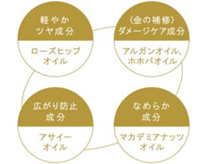 サラサラな質感が続くオイルを厳選して、“砂漠の黄金”と呼ばれる「アルガンオイル」をはじめ、5種類の植物オイルにたどり着きました。髪1本1本をコートしながら、軽い仕上がりと、瞬時にツヤを宿した美しい質感を叶えます。