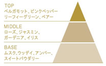 ウッディムスク調の甘美なローズと、ジャスミン、ガーデニアが織りなす甘いシックな香り。洗った瞬間に、ふわっと華やぐ気分へと誘い、ドライ後も髪が揺れるたびに、ほのかに香り立ちます。エレガントなオーラをまとったような、女性らしい印象を演出します。神崎さんがこだわり抜いた“風に揺れるたび、恋に落ちる香り”を表現しています。