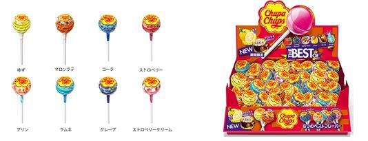 | 特徴 | ・発売以来、世界中で愛されるロリポップキャンディ「チュッパチャプス」 ・人気のフレーバー6種類(「コーラ」「ストロベリー」「プリン」「ラムネ」「グレープ」「ストロベリークリーム」)に、期間限定フレーバー2種類(ほっこり「マロンラテ」とさっぱり「ゆず」)を追加 |