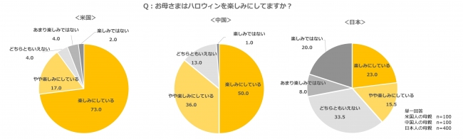 各国の母親に対しても同様に、ハロウィンを楽しみにしているかを尋ねた。米国の母親の90.0%(「楽しみにしている」73.0%、「やや楽しみにしている」17.0%の合計)、中国の母親の86.0%(「楽しみにしている」50.0%、「やや楽しみにしている」36.0%の合計)、日本の母親の38.5%(「楽しみにしている」23.0%、「やや楽しみにしている」15.5%の合計)が「ハロウィンを楽しみにしている」と回答し、米国、中国においては母親も子どもと一緒にハロウィンを楽しみにしている様子がうかがえる結果となった。