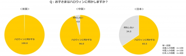 Ⅰ-2. 日本の子どもの6.5割が「ハロウィンに何かする」と回答。米国は100%、中国では96.0%と非常に高い結果に。