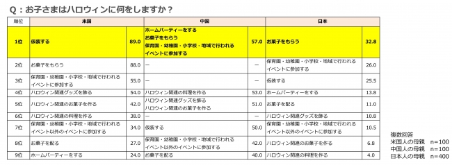 ハロウィンでは、米国は「仮装」、中国は「ホームパーティー」、日本は「お菓子をもらう」が最も多い回答に。