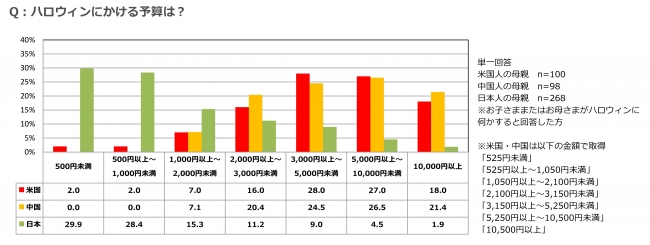 母親または子どもが「ハロウィンで何かする」と回答した各国の母親を対象に、今年のハロウィンにどのくらいお金をかける予定かを尋ねた。中国では「5,000円以上から10,000円未満」(26.5%)、米国では「3,000円以上から5,000円未満」(28.0%)、日本では「500円未満」(29.9%)と回答した人が最も多く、「10,000円以上」と回答した人は中国、アメリカでは約2割いたものの、日本では約2%しかいなかった。中国がハロウィンに最も多くお金をかけていることがうかがえる結果となった。