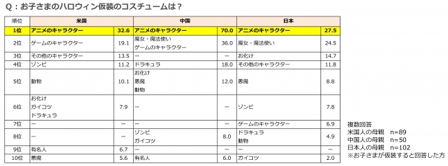 子どもが今年のハロウィンで仮装すると回答した各国の母親に対して、今年は何のコスチュームを着るかを尋ねたところ、最も多かった回答は各国共通して「アニメのキャラクター」だった。