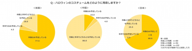 子どもが今年のハロウィンで仮装すると回答した各国の母親に対して、ハロウィンのコスチュームを購入するか、手作りするかを尋ねた。米国、日本では「市販のものを購入する予定」と回答した人が多く(米国:77.5%、日本68.6%)、中国では「市販と手作りどちらも予定している」と回答した人(86.0%)が多かった。