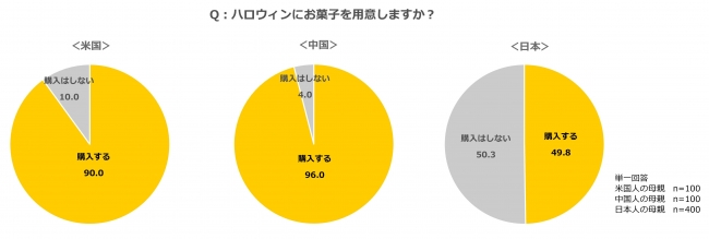 各国の母親を対象に、ハロウィンのためにお菓子を購入するかを尋ねたところ、米国では90.0%、中国では96.0%、日本では49.8%が「購入する」と回答した。