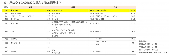 各国の母親を対象に、ハロウィンにどのようなお菓子を購入するかを尋ねた。最も多かった回答は、中国、日本は「チョコレート」、米国は「キャンディ」だった。米国、日本では「チョコレート」や「キャンディ」のほか、「ビスケット」や「マシュマロ」など様々な場所で食べやすいお菓子が人気だった一方、中国では「ケーキ」「ドーナツ」「知育菓子(R)」など特別感のあるお菓子も人気という結果が得られた。