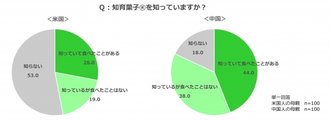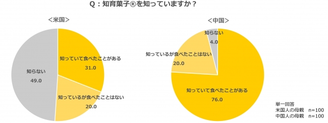 米国と中国の母親それぞれに対して、知育菓子(R)を知っているかどうかを尋ねた。「知育菓子(R)を知っている」と回答した割合は、米国では51.0%(昨年は47.0%)、中国では96.0%(昨年は82.0%)で、どちらの国も昨年より認知度が上がった。