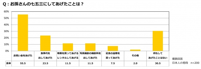 同居していない3歳から9歳の孫をもつ祖母に対して、孫の七五三にしてあげたことについて尋ねたところ、「お祝い金をあげた」と55.5%が回答した。「食事代を出してあげた」と回答した人は23.5%、「晴着を買ってあげた(レンタルしてあげた)」「写真撮影の撮影料を出してあげた」は11.5%だった。