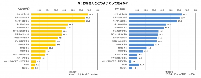 祖母を対象に、孫とどのようなことをして遊ぶかを尋ねたところ、最も多かった回答は「一緒におやつを食べる」(68.5%)だった。以下、「一緒に散歩や公園で遊ぶ」「一緒に買い物へ出かける」(65.0%)、「一緒に本・絵本を読む」(44.5%)、「一緒にお絵かきをする」(41.5%)が続いた。