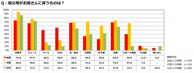 米国、中国、日本の母親を対象に、祖父母が孫に買っているものを尋ねたところ、最も多かった回答は各国共通して「お菓子」(米国:74.0%、中国:95.0%、日本:86.8%)だった。