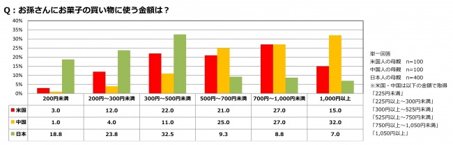 米国、中国、日本の母親を対象に、祖父母が孫と一緒にお菓子を買いに行った場合、1回あたりいくらまで買っていると思うかを尋ねたところ、中国では「1,000円以上」(32.0%)と回答した人が最も多く、米国では「700円から1,000円」(27.0%)、日本では「300円から500円」(32.5%)で、中国が最も多く孫のお菓子のためにお金を使っている様子が明らかになった。
