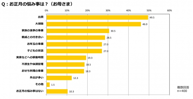 対して、お母さんのお正月の悩み事は現実的。約半数が「出費」、4割以上が「大掃除」、3割以上が「家族の食事の準備」と回答。