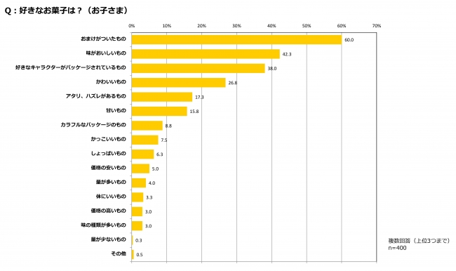 子どもを対象に、どのようなお菓子が好きかを尋ねた。最も多かった回答は、「おまけがついたもの」(60.0%)で、以下、「味がおいしいもの」(42.3%)、「好きなキャラクターがパッケージされているもの」(38.0%)、「かわいいもの」(26.8%)、「アタリ、ハズレがあるもの」(17.3%)と回答した。子どもにとって、お菓子は味以外にもおまけや見た目も購入の動機になることが伺える結果となった。