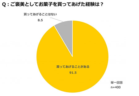 母親を対象に、子どもにご褒美としてお菓子を買ってあげることがあるかを尋ねたところ、全体の91.5%が「ご褒美お菓子を買ってあげたことがある」と回答した。