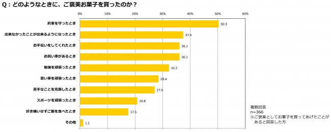 Ⅱ.「ご褒美お菓子」、9割以上が買ってあげたことがあると回答。買ってあげるタイミングは「約束を守ったとき」「できなかったことができるようになったとき」「お手伝いをしてくれたとき」。