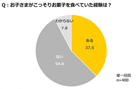 母親を対象に、子どもがこっそりおやつを食べていたことがあるかを尋ねたところ、「ある」と回答した人は全体の37.5%で、子どもがこっそり食べているつもりでも、4割近くの親は気づいているということがうかがえる結果となった。