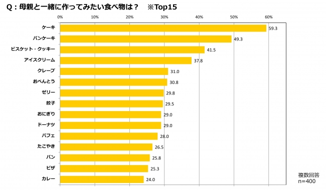 子どもに対して、母親と作ってみたい食べ物を尋ねたところ、「ケーキ」と回答した人が全体の59.3%に上った。「パンケーキ」や「ビスケット・クッキー」が2位、3位にランクインした一方で、「おべんとう」が6位、「餃子」が8位、「おにぎり」が9位にランクインするなど、お菓子作りだけでなく料理にも興味がある様子がうかがえる結果となった。