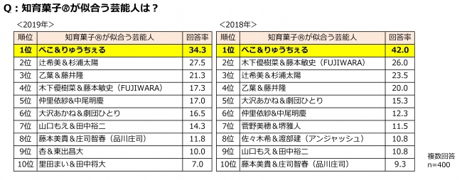 母親を対象に、親子で作って食べる「知育菓子(R)」が似合うと思う芸能人夫婦を尋ねたところ、ぺこ&りゅうちぇるさん夫婦が1位で、全体の34.3%が「知育菓子(R)が似合う」と回答した。昨年実施した同様の調査でも、ぺこ&りゅうちぇるさんが1位で、2年連続の1位獲得となった。