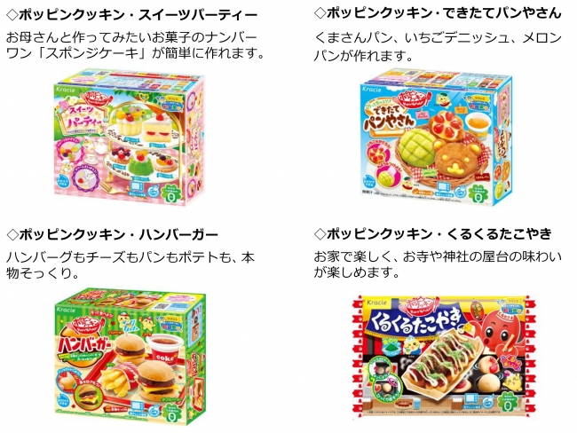 クラシエフーズは、子どもの豊かな創造力を育む商品として好評の知育菓子(R)シリーズより、水と粉だけで本物そっくりなお菓子作り体験ができる、「ポッピンクッキン」を発売しています。お店屋さんのような手作り体験と本格的な味を楽しめるので、お正月に家族や親せきと楽しみながら作ってみてはいかがでしょうか。