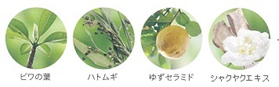 <ビワの葉エキス、ハトムギエキス、ゆずセラミド(ユズ果実エキス)、シャクヤクエキス>