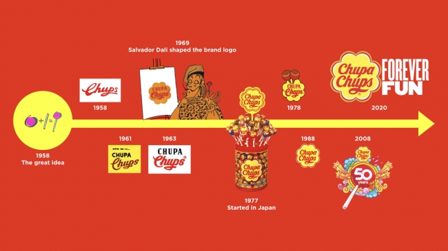 「チュッパチャプス」は、1958年のスペインでの発売以来、その特徴的な形状とバラエティ豊かなフレーバーが、世界中で支持されてきました。1969年、スペインを代表する画家、サルバドール・ダリの創造的なひらめきによって生まれたロゴマークは、少しずつ形を変えながら今日まで愛され続けています。日本では1977年から販売されており、斬新なデザインの店頭ディスプレイとともに、幅広い年齢層に愛されています。