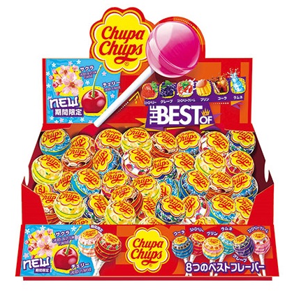 今回、新発売する「チュッパチャプス ザ・ベスト・オブ・フレーバー」には、これからの季節にぴったりな期間限定のフレーバーが仲間入りしました。チュッパチャプスの代表的な人気フレーバー6種類(「コーラ」「ストロベリー」「プリン」「ラムネ」「グレープ」「ストロベリークリーム」)と、春の訪れを感じる新フレーバー「サクラ」が登場、また人気フレーバーの「チェリー」が復活し、合計8種類で展開いたします。