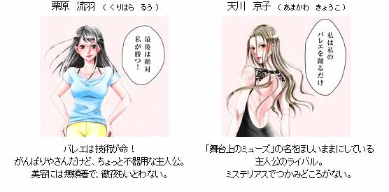 バレエ団のトップダンサーである「プリンシパル」を目標にして、情熱的に日々を生きる「流羽」。クールでミステリアスだけれど、バレエの表現力がピカイチな「京子」。