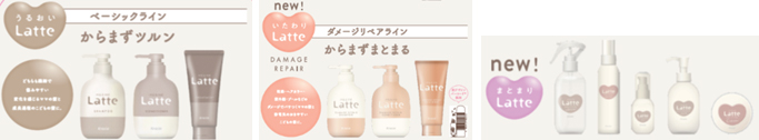 「マー&ミー ラッテ」のインバスヘアケアは「ベーシック」ラインと「ダメージリペア」ラインの2ライン、アウトバスヘアケアは、「洗い流さないトリートメント」(2品)&「スタイリング」(3品)で展開します。
