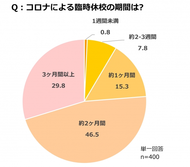 小学1年生から3年生の子どもをもつ母親を対象に、新型コロナウイルスの感染拡大による臨時休校についての実態を尋ねた。子どもが通う小学校において、どのくらいの期間休校となったかを尋ねたところ、3ヵ月以上が29.8%、約2ヵ月が46.5%、約1ヵ月が15.3%、約2-3週間が7.8%、1週間未満が0.8%だった。調査対象者の約3/4が2ヵ月以上もの間子どもの学校が休校になっていたことが分かった。
