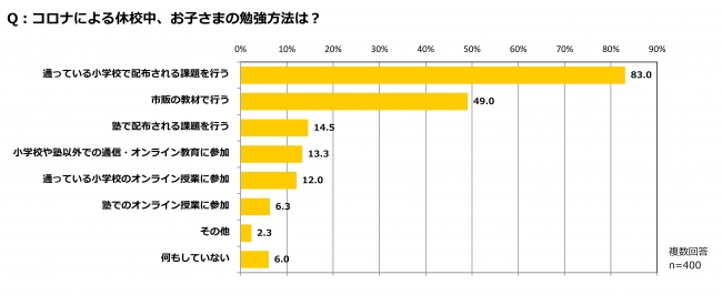 コロナ休校中、子どもがどのように勉強していたかを尋ねたところ、「通っている小学校で配布される課題を行う」と回答した人が83.0%と最も多かった。「市販の教材で行う」と回答した人は49.0%にのぼり、課題以外の勉強も自主的に行っていたことが分かった。