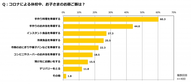 Ⅲ.コロナ休校中、子どものお昼ご飯は約6割が「手作りの料理を準備」、4割以上が「手作りのお弁当を準備」したと回答。「インスタント食品」「冷凍食品」「市販のおにぎりやパン」などの利用も。