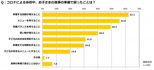 母親に対して、コロナ休校中の子どもの食事の準備で困ったことについて尋ねたところ、最も多かった回答は「料理する回数が増えること」(62.3%)だった。以下、「メニューを考えること」(55.8%)、「栄養バランスを考えること」(49.3%)、「買い物が増えること」(40.0%)と続いた。