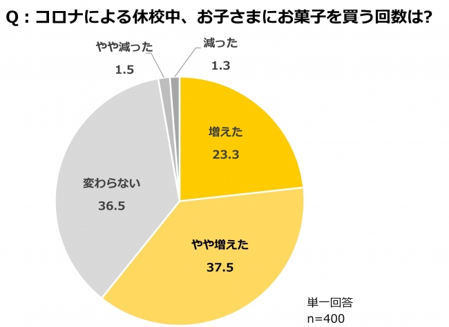 コロナ休校中にお菓子を買う回数の変化について尋ねたところ、60.8%が「増えた」(「増えた」23.3%、「やや増えた」37.5%)と回答した。
