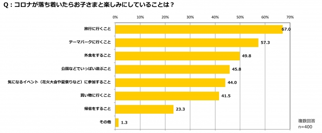 コロナが落ち着いたら、「旅行」や「テーマパーク」に行きたい!「外食」や「公園で遊ぶ」などの回答も。