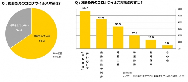 正社員・派遣社員として働く母親を対象に、自身の勤め先でコロナ対策として在宅勤務などの取り組みが行われたかを尋ねたところ、「対策を実施している」と回答した人は65.3%だった。