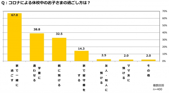 コロナ休校中に子どもがどのように過ごしたかを尋ねたところ、67.0%が「家で一緒に過ごした」と回答した。「学童に通わせた」と回答した人は38.8%、「親に預けた」と回答した人は32.5%で、仕事の関係などで子どもを預けた人もいたことも分かった。