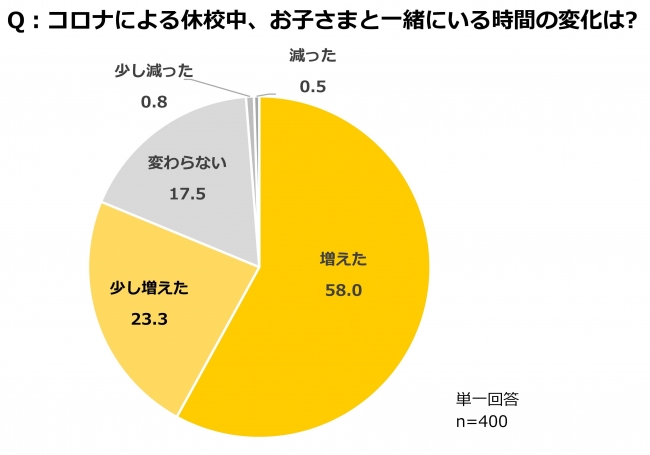 コロナ休校で子どもと一緒にいる時間は休校前と比べて変化したかを尋ねたところ、81.3%が「増えた」(「増えた」58.0%、「少し増えた」23.3%の合計)と回答した。