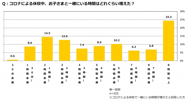さらに、子どもと一緒にいる時間が増えたと回答した人に対して、どのくらい増えたかを尋ねたところ、「8時間以上」と回答した人が全体の24.3%にのぼった。