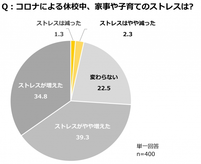 母親を対象に、子どもがコロナ休校中、家事や子育てのストレスが増えたかを尋ねたところ、74.1%が「ストレスが増えた」(「ストレスが増えた」34.8%、「ストレスがやや増えた」39.3%の合計)と回答した。子どもとの時間が増えて嬉しい反面、ストレスにも感じる母親の心情が明らかとなった。