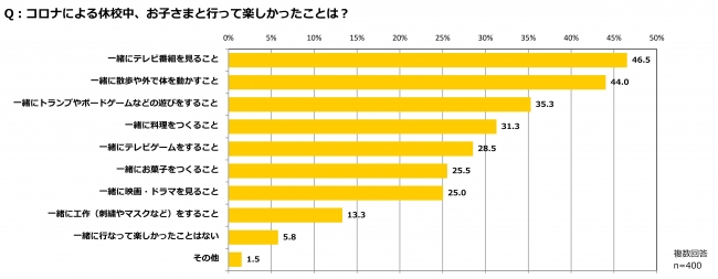 母親に対して、コロナ休校中に子どもと行って楽しかったことを尋ねた。最も多かった回答は「一緒にテレビ番組を見ること」(46.5%)で、以下、「散歩や外で体を動かすこと」(44.0%)、「トランプやボードゲームなどの遊びをすること」(35.3%)と続いた。
