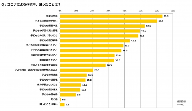 一方、コロナ休校で自身が困ったことについても尋ねたところ、最も多かった回答は「食事の用意」で63.5%が困ったと回答した。以下、「子どもの宿題の手伝い」(60.3%)、「子どもの運動不足」(52.5%)と続いた。