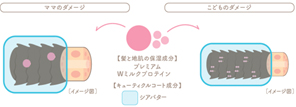 「たんぱく質」を豊富に含むミルク由来成分で、おとなと子どもの異なるダメージの両方を補修し、毛先までうるおい、からまない、指どおりツルンとした髪へ導きます。